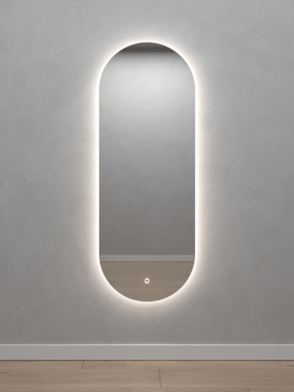 Безрамное зеркало овальной (капсульной) формы с контурной (тыльной) тёплой подсветкой, свет 3000К. Подложка из высококачественного МДФ, светодиодная лента защищена матовым свето-рассеивателем от попадания пыли и влаги. Есть вывод 220W для подключения к сети, включение подсветки от сенсорной кнопки на зеркале.
